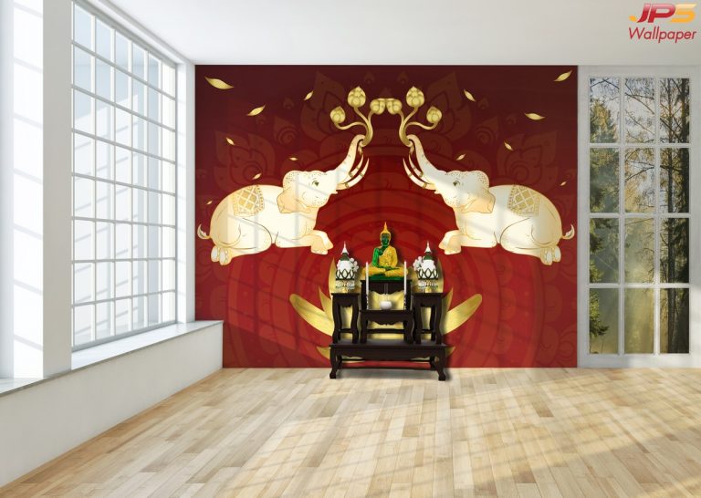 วอลเปเปอร์สั่งพิมพ์ ลายไทยช้างคู่ พื้นหลังสีแดง